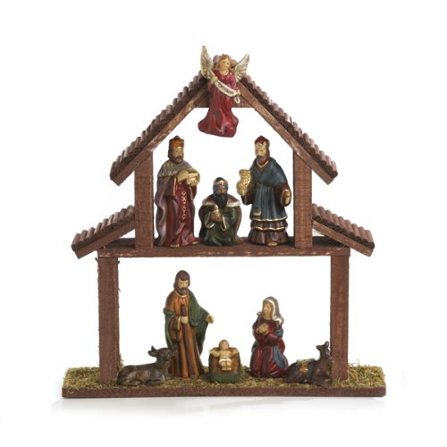 This ten piece traditional porcelain nativity features a two tier wooden crèche and figurines crafted of porcelain. Tallest figure stands 4-1/2 inches trall.Available at Amazon >>Check Price Now!<<